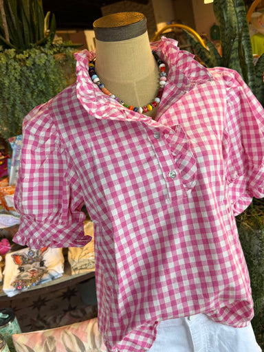 The Pink Gingham Too is a king-size short sleeve top designed for comfort and style. Featuring rough detailing buttons, this garment combines funct...