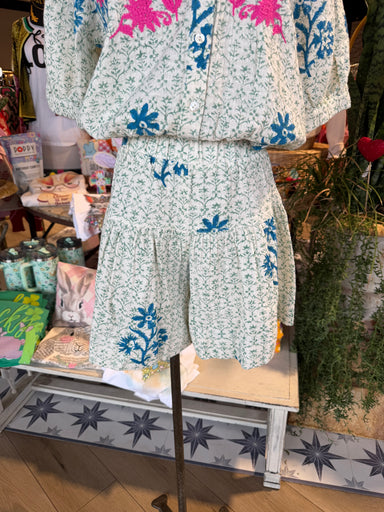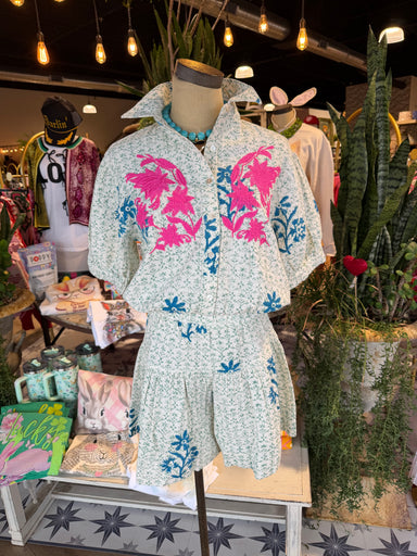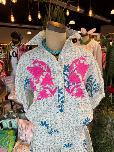 The Ava Shirt/Jacket features a custom floral print that enhances visual appeal while the button-gathered embroidery detailing adds dimension and t...