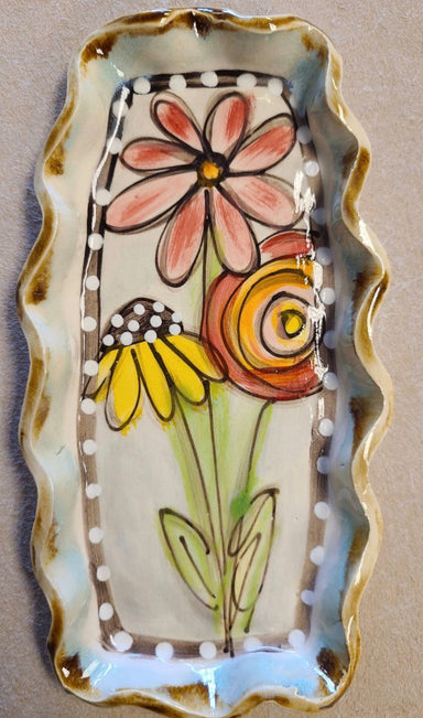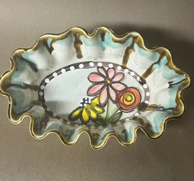 This ruffled-edge ceramic tray is decorated with a lively hand-painted wildflower design in warm, cheerful colors. Featuring a pink daisy, golden s...