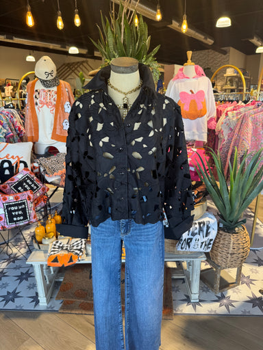 The Victoria Eyelet Top is a stunning addition to any wardrobe. Its black eyelet detailing adds a touch of elegance to this long sleeve, hundred pe...