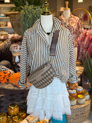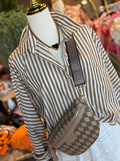 This caramel brown Brandi Stripe Top boasts a striped design and short dolman sleeves. Expertly crafted, it offers both comfort and style for a ver...