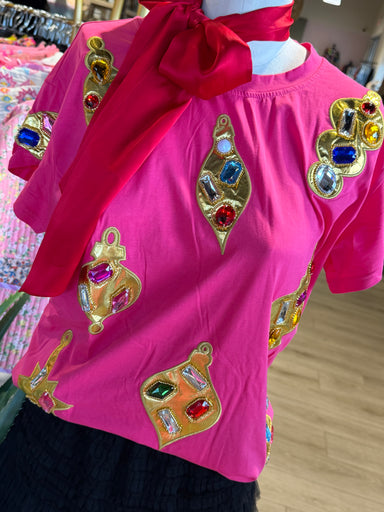 Hot pink with gold embellished ornaments. Slightly oversized 92% cotton8% spandex Circumference:XS- 40 inchesS- 42 inchesM- 44 inchesL- 46 inchesXL...