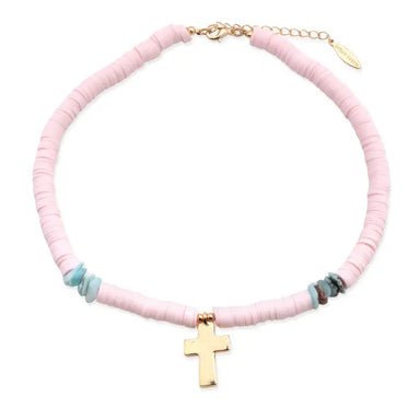 Pastel pink clay heisi necklace with larimar stones and small gold cross, 16" with 2" extender