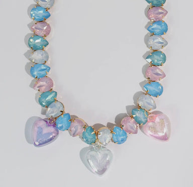 A dreamy mix of soft pastel gemstones and delicate heart charms. This statement necklace features soothing shaded of blue, blush, and crystal clea...