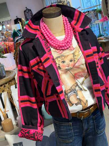 Upgrade your wardrobe with our stylish Plaid Jacket! Made in the USA from soft cotton, this cropped jacket features a pink and red plaid pattern wi...