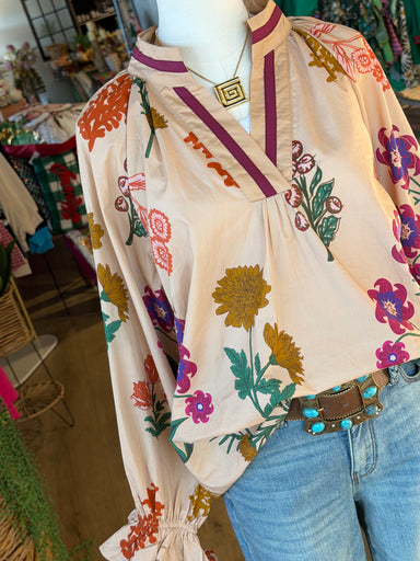 Floral Print V Neck Open Collar Top Contrast Binding Floral Print V Neck Collar Not Lined Model is 5'9" and is wearing a small. 100% Cotton circu...