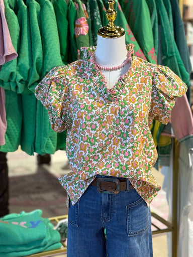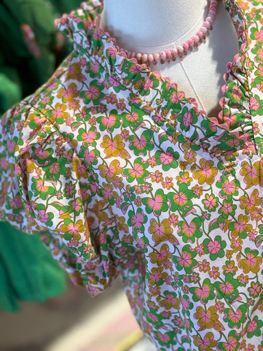 The Polly Ann Top features a vibrant red and green plaid design with delicate ruffles around the neck and on the sleeves. Made with 100% cotton, th...