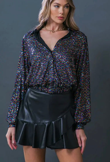 Introducing Party On Top - the must-have addition to your wardrobe. This multi-color sequin collard top adds a touch of glamour and sparkle to any ...