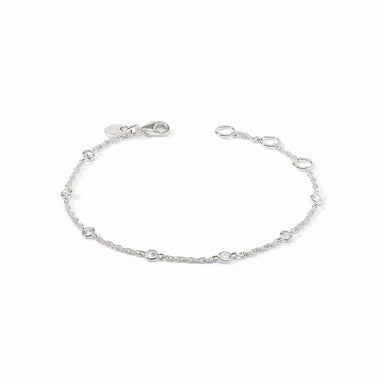 Pure silver plate (tarnish-free) Inner circumference: 7 inches Width: 0.3 inches Closes with spring hinge Julie Vos hallmark