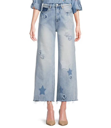 Designed in wide pants in french terry with star patch, lace point, raw edge, vintage washing, solid color. Specs/Dimensions: - WAIST: 13" (ELASTIC...