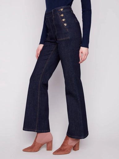These medium blue jeans feature a fashionable flare leg design that’s sure to turn heads. The patch pockets include rivets for a touch of flair, an...