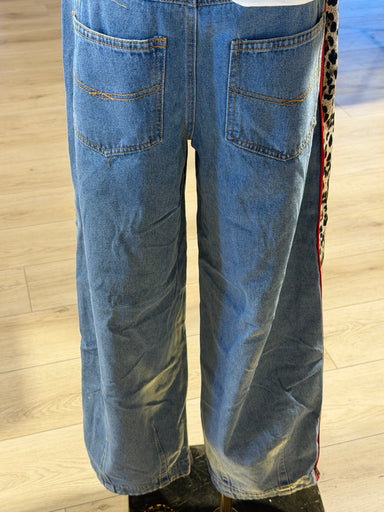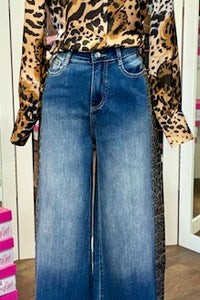 A bold twist on a classic silhouette, these wide leg jeans feature sleek denim front panels paired with striking leopard print insets along the out...