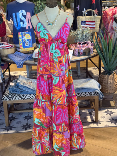 Discover the ultimate summer style with our Leilani Maxi Dress. Featuring a vibrant multi-tropical print, this halter dress is perfect for any beac...