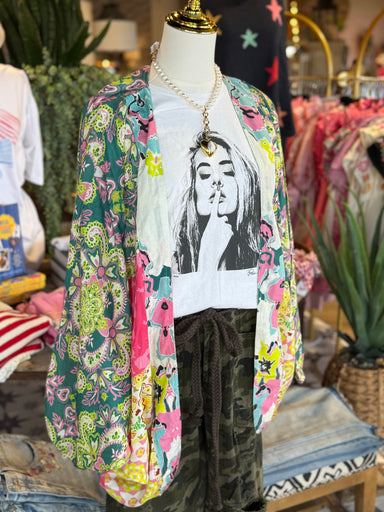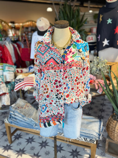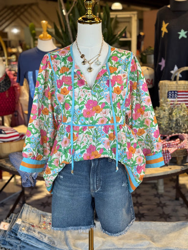 The mandolin top in vintage daisy blends, laid-back ease with bohemian flair, making it a stand out for fall. It’s Doman sleeve. Silhouette creates...
