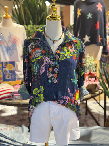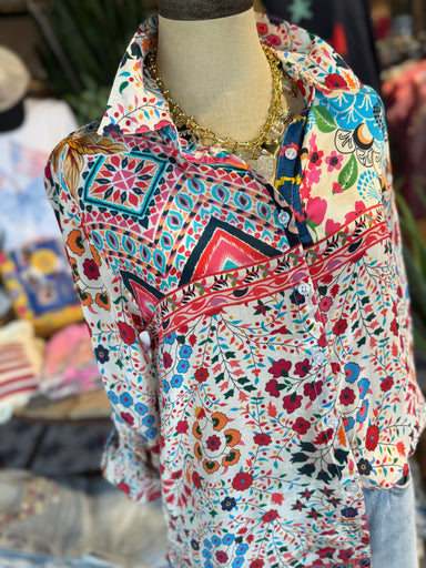 Embellished with a striking graphic print in bold colors, the Lorelie Button Down Tunic is a wardrobe statement piece. Crafted from a rich silk ble...