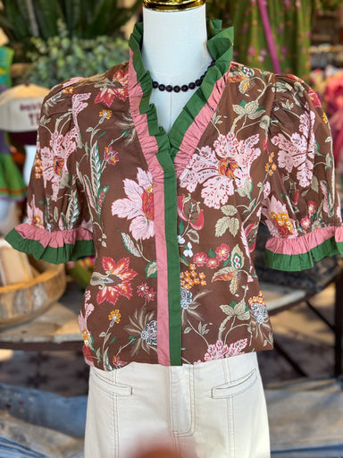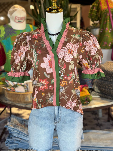 The Bella Top is the perfect transition piece for the fall season. This floral top, made with a rayon blend in beautiful shades of brown, adds a to...