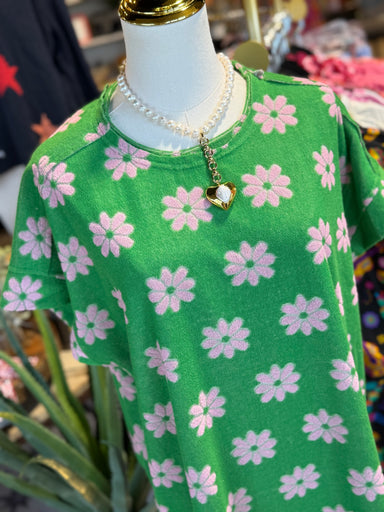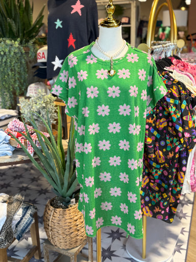 Stay cool and stylish in our Kaya Kay Dress! Made of green terry cloth with a playful pink floral pattern, this dress is perfect for running around...