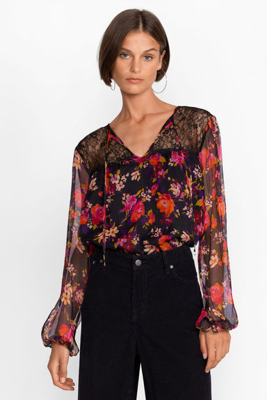 Spun from sumptuous silk, the Flora Silk Blouse conjures images of a fragrant floral garden. Peppered with vivacious blooms in saturated tones, thi...