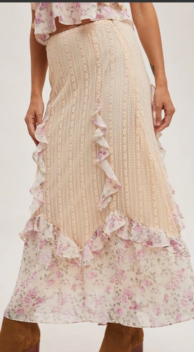 Floral print trimmed maxi lace skirt with lining. This stunning maxi skirt features a beautiful floral print trim that complements its intricate la...