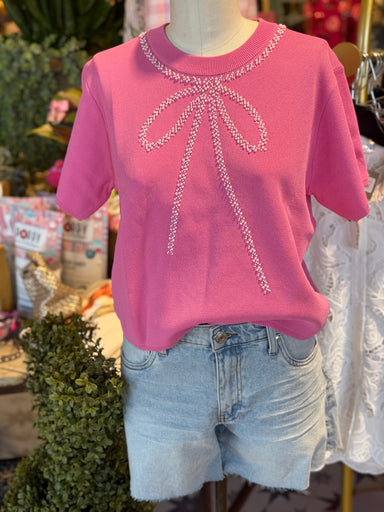 Light weight knit pink short sleeve with pearl embellishments to outline a bow. small 2/4 medium 6/8 large 10/12