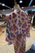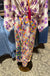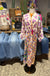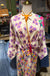 The twisted waist detail creates a flattering silhouette, cinching at the natural waistline. Wide kimono sleeves and midi length with front slit offer flowing, comfortable elegance. Printed by Me369, this piece blends sharp geometric forms with vibrant florals in bold marker colors.