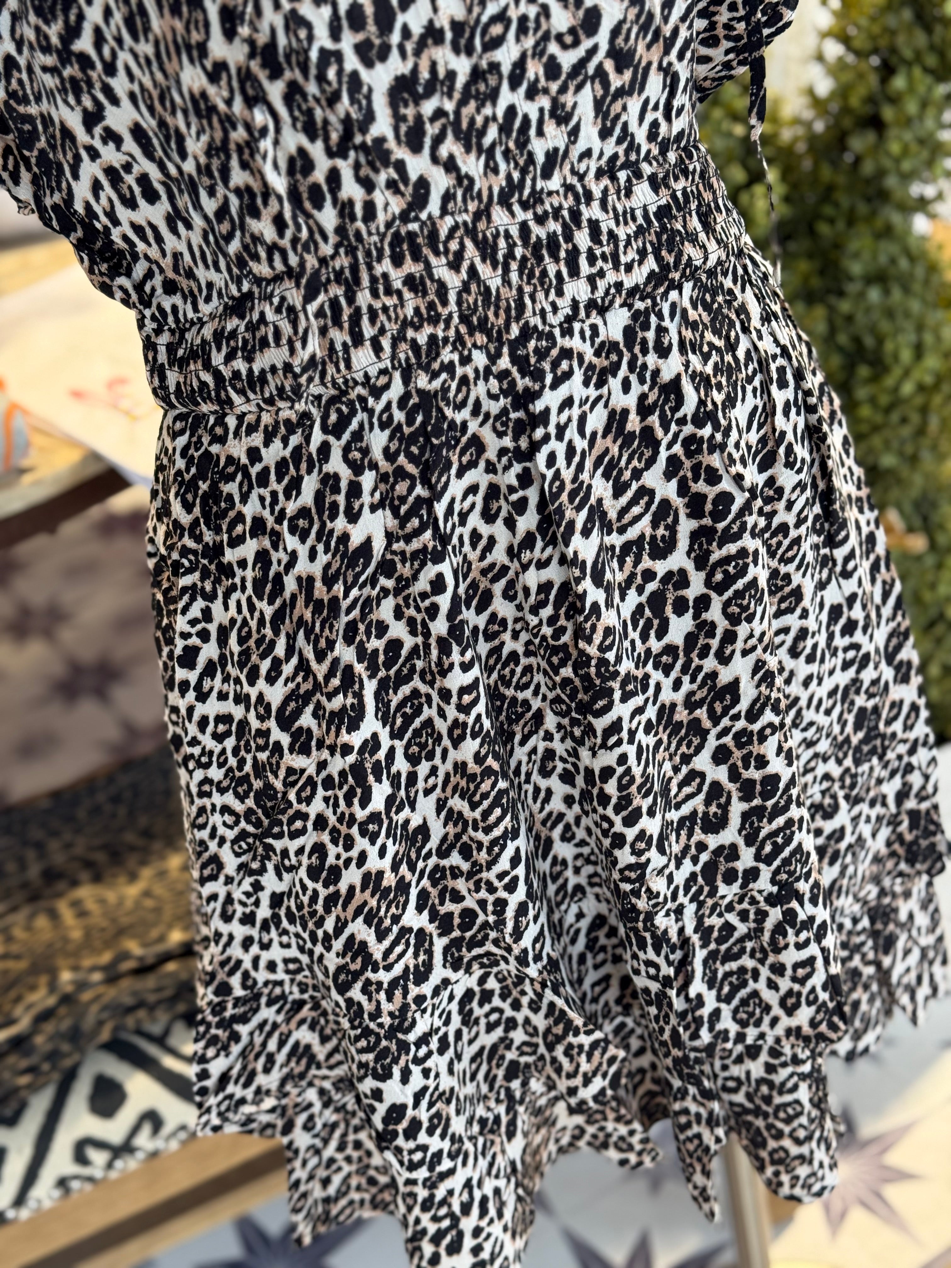 Super flattering cheetah fabric dress with smocked skirt waistline. Runs true