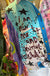 Mixed patterns create a festival-ready look with diamond geometrics, vertical stripes, polka dots in rainbow hues, and golden honeycomb details on the cuffs. Soft watercolor washes in pink, blue, and orange blend with runic scripts for a truly spiritual aesthetic.