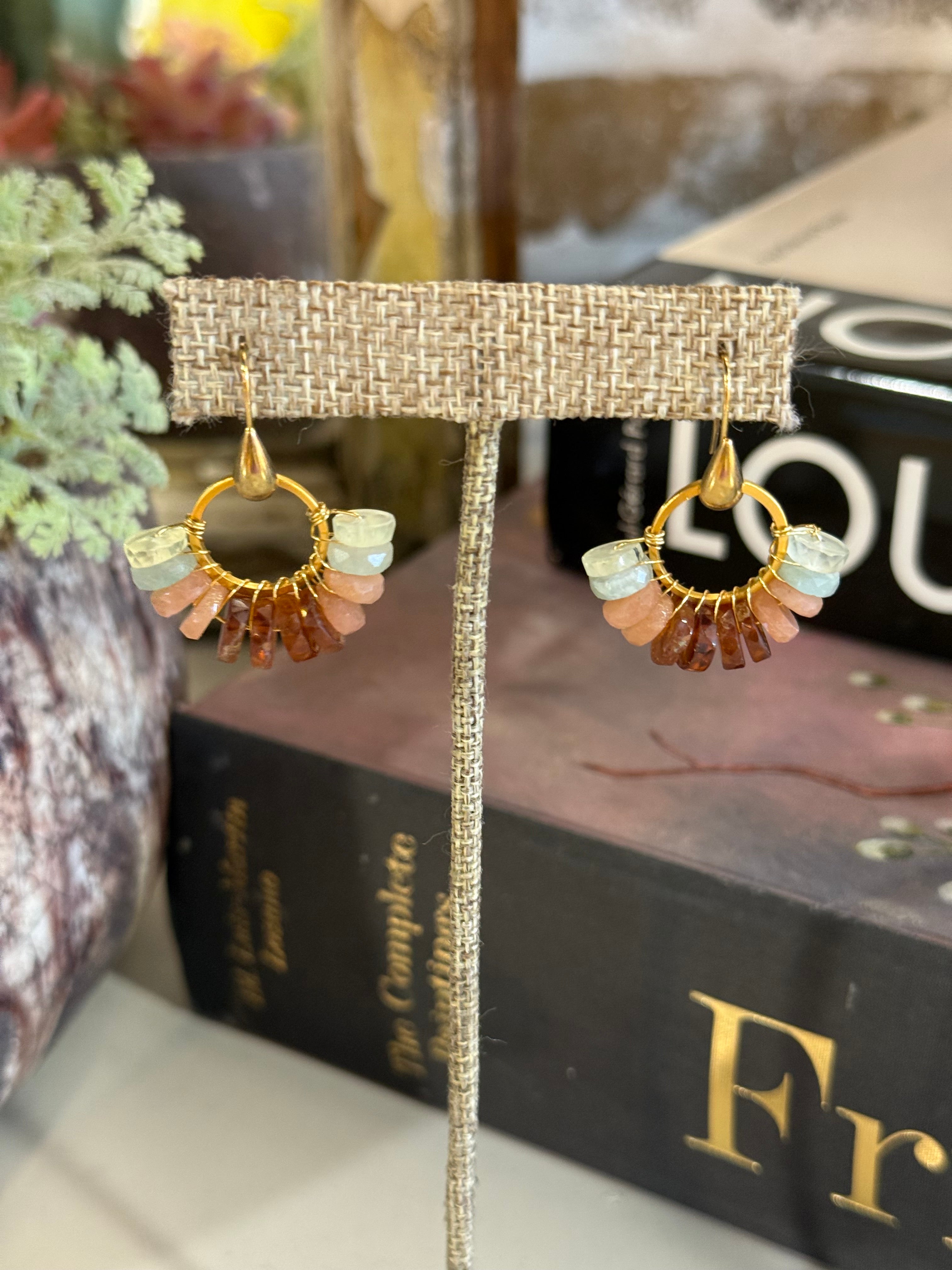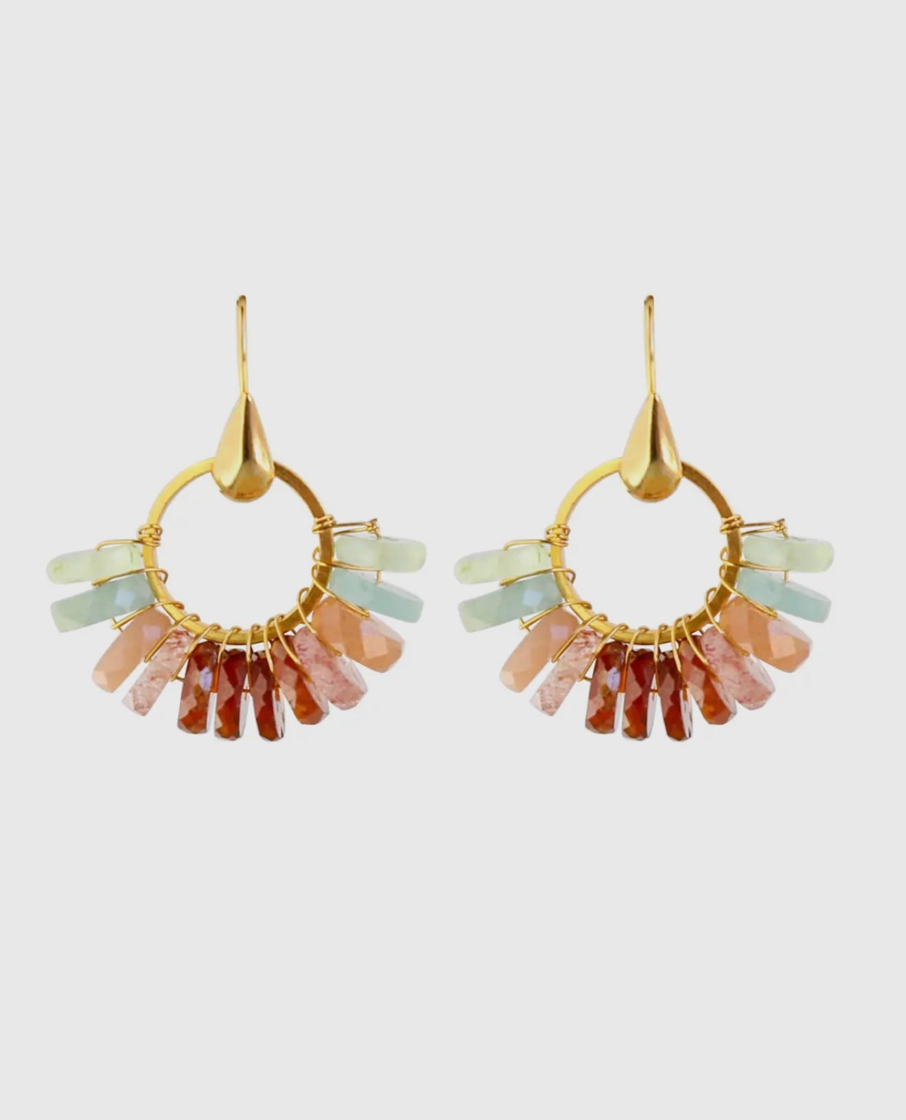Our spring line was inspired and named by dances around the world. Playful yet sophisticated, these earrings showcase a vibrant gradient of gemstones, each delicately hand-wrapped around a plated bronze circle We find that our retailers say our earrings are for those who like to spoil not only themselves, but those they love. Our earrings are truly a celebration of individuality, and for those who value thoughtful details and enjoy feeling put together for any outing, from lunch, to the nail salon, to carline and everything in between.