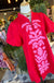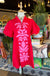The Lila Ann Dress features a vibrant red fabric complemented by slight puff sleeves and intricate pink embroidery. The button details enhance the garment's aesthetic while providing functional versatility. This design balances elegance with comfort, making it suitable for various occasions. The dress combines style with practical wearability.