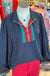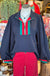 The Lindsey Top in navy is a sophisticated addition to your wardrobe. Made from a comfortable cotton spandex blend, this top features a bold red and green design around the neckline and sleeves. The half-zipper front adds a touch of modernity to this classic piece. Perfect for both professional and casual occasions.