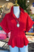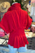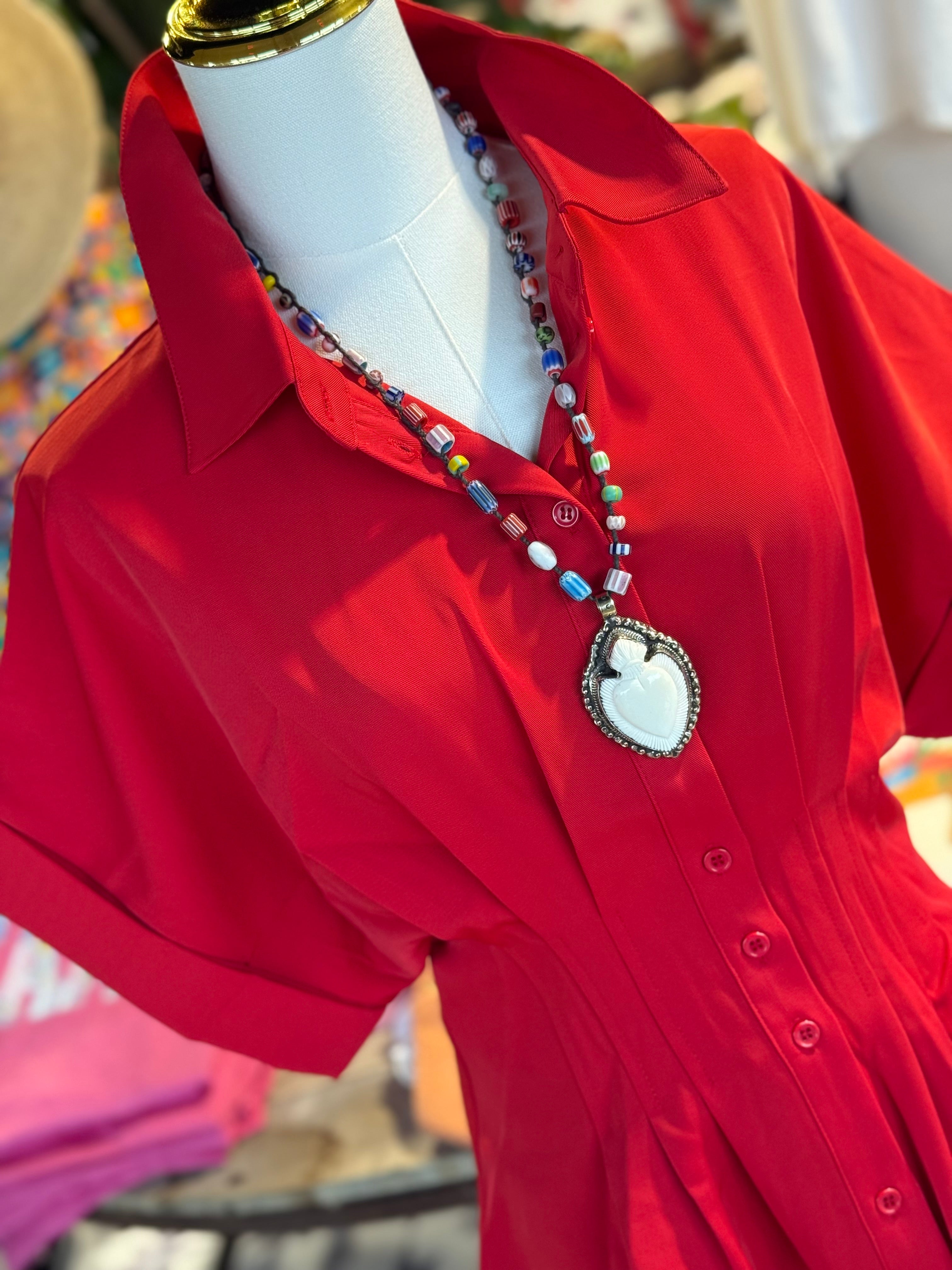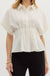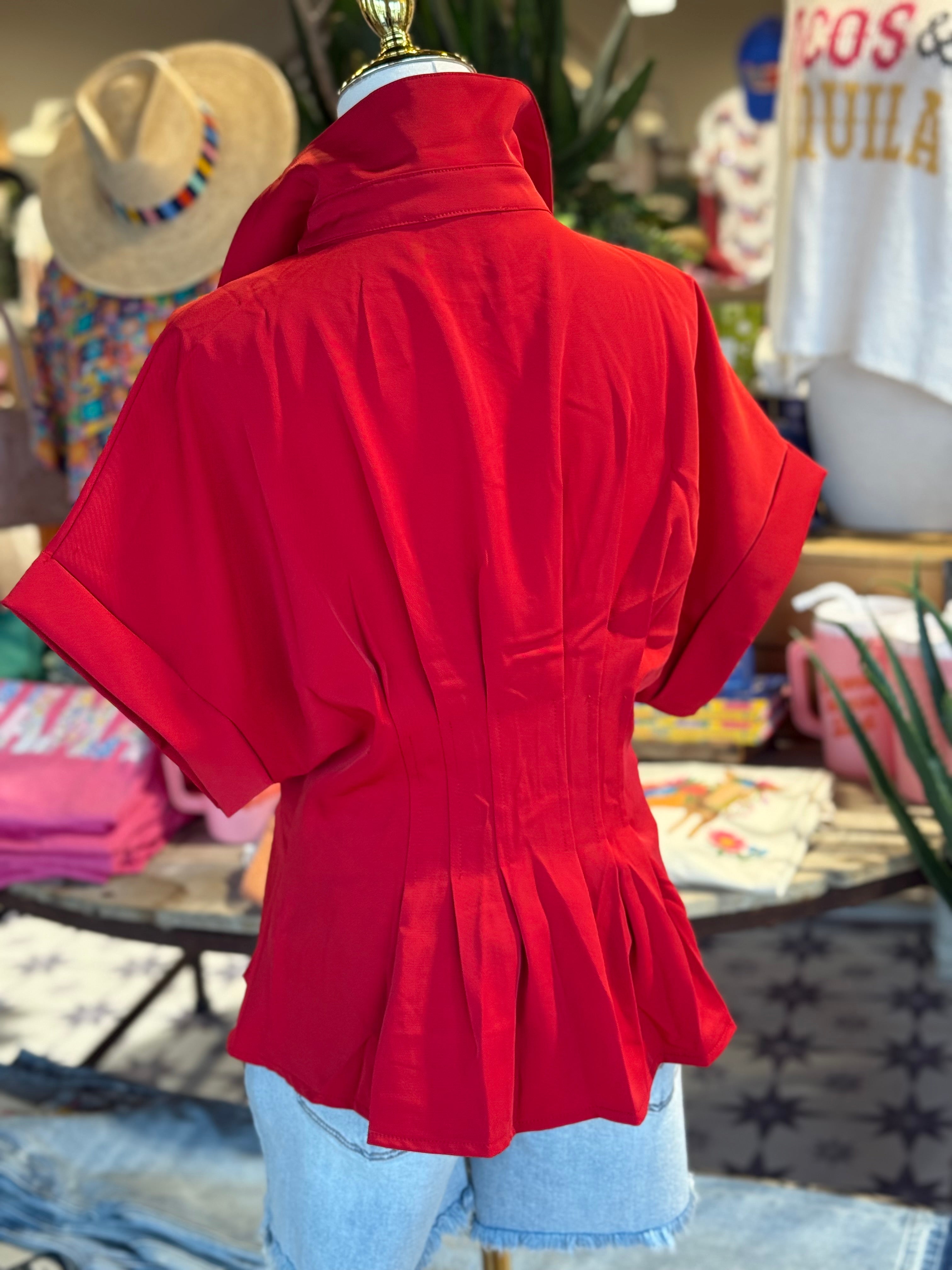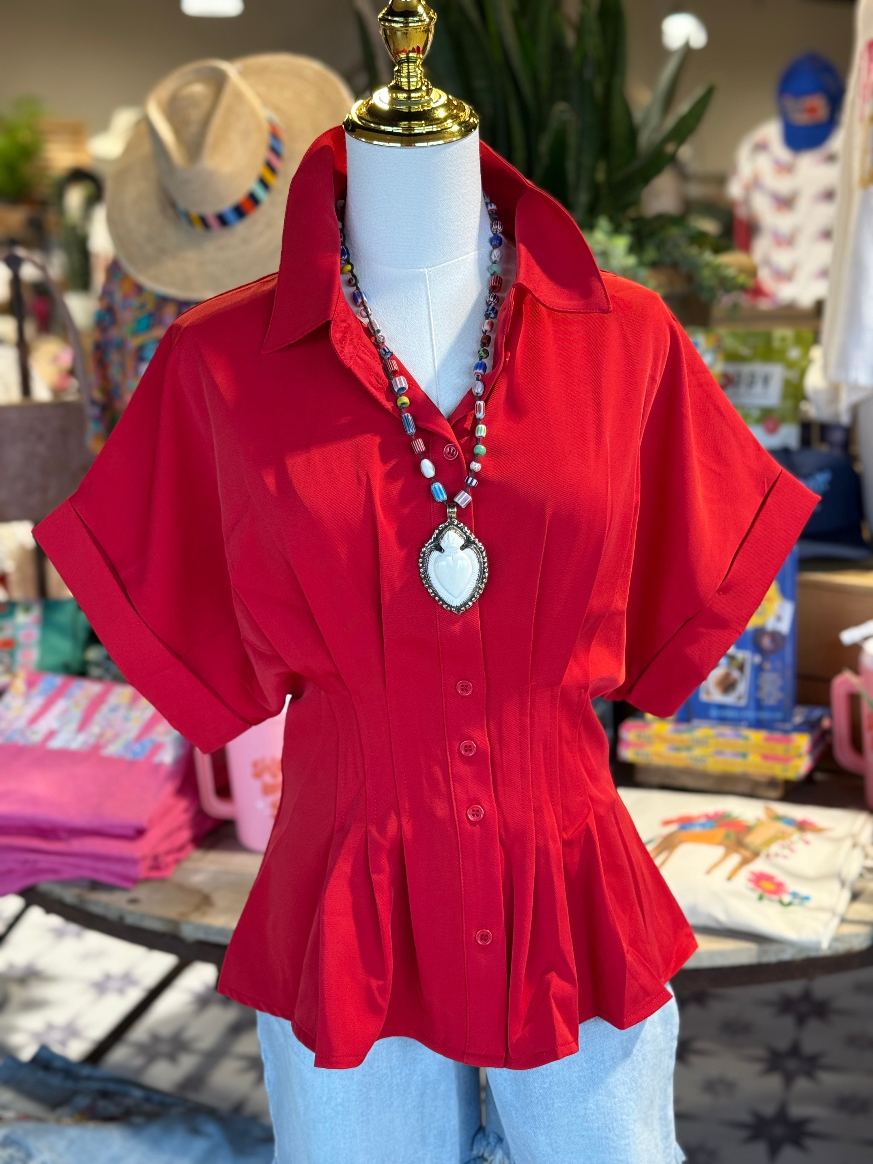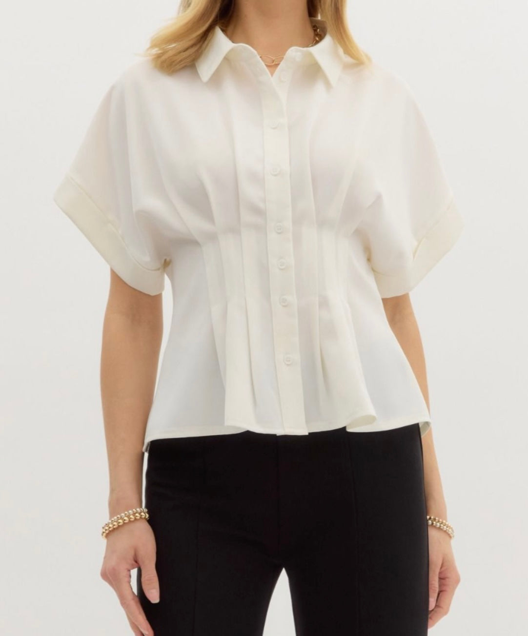 Solid short roll-up sleeve pleated mid-length top. Collar button front closure. Unlined. Woven. Non-sheer. Lightweight.