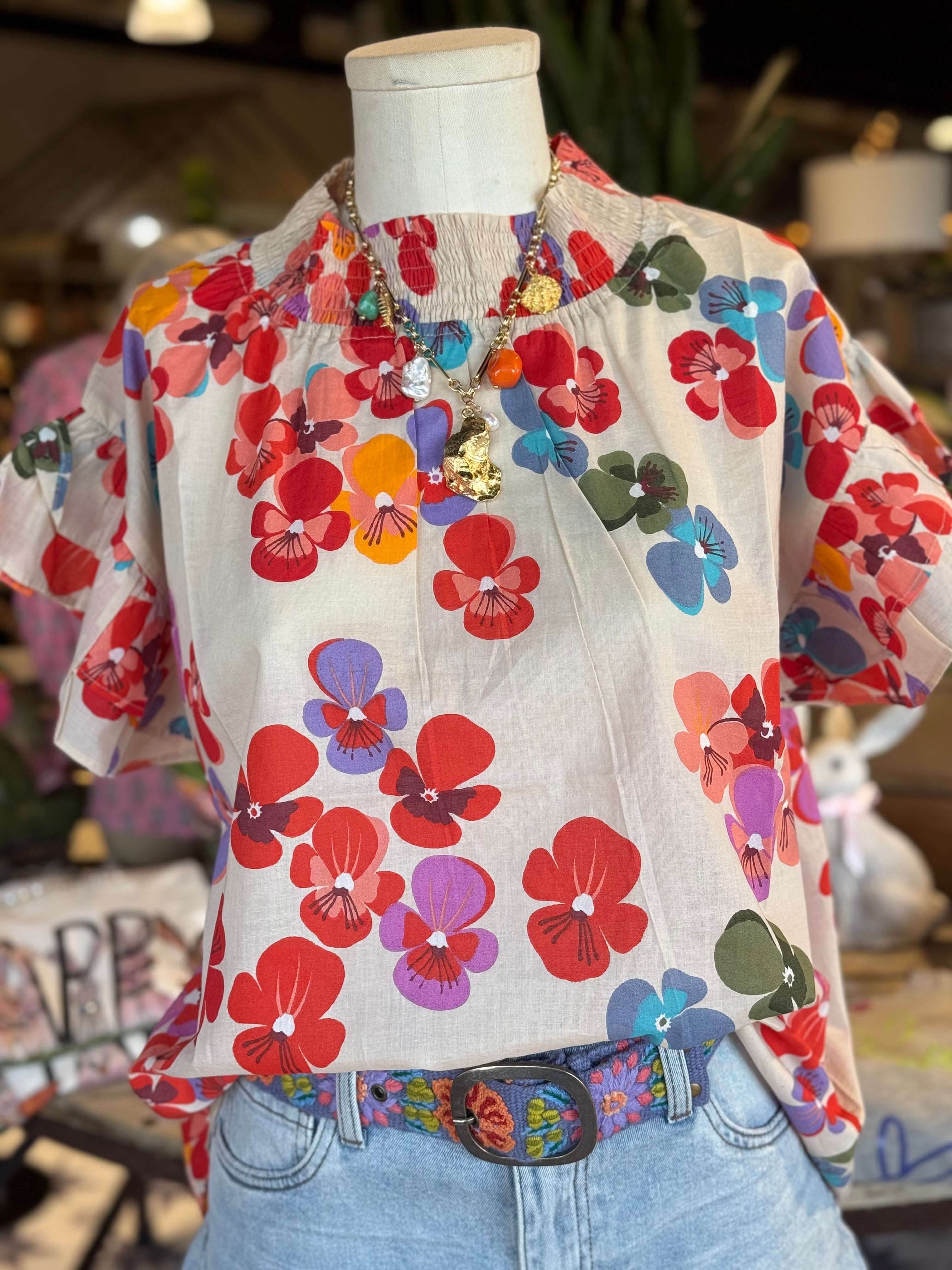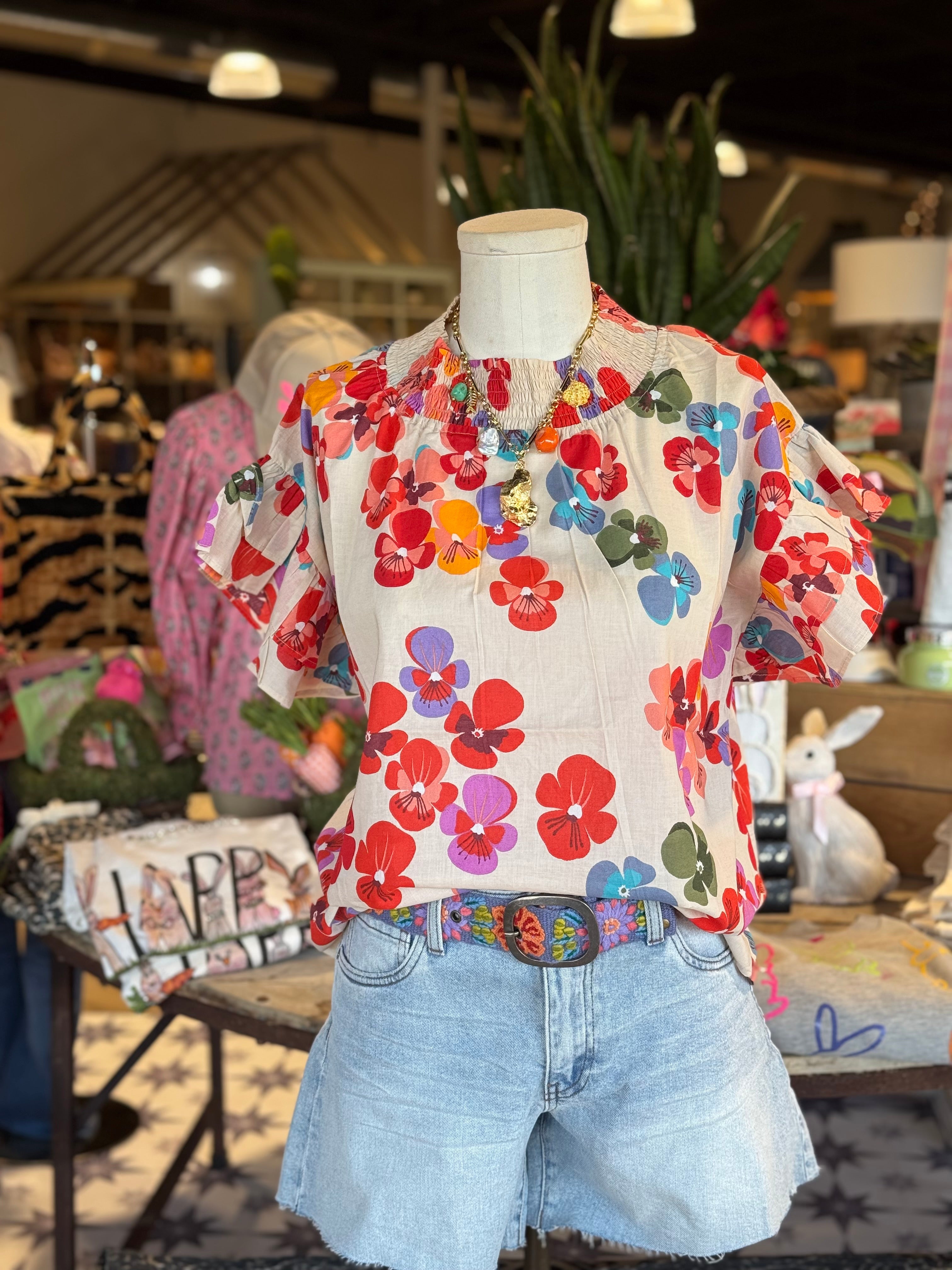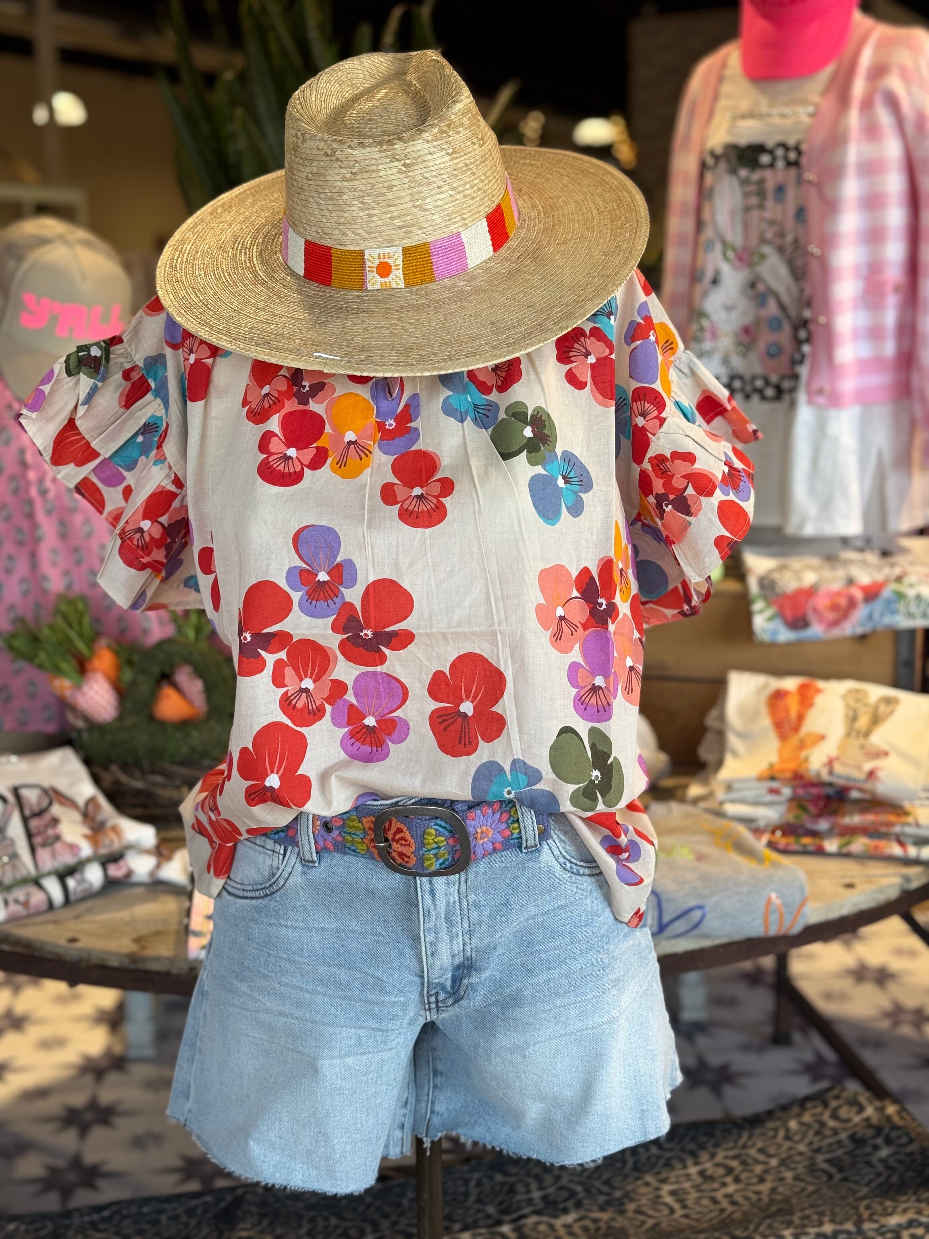 Playful colorful floral print with ruffle detailing. Best selling silhouette. One size