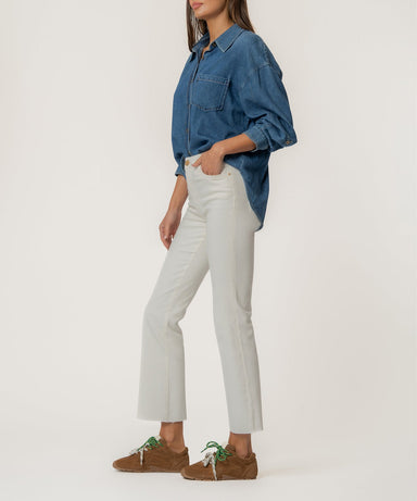 Elevate your look with these high-rise ankle flare jeans in a chic ecru color that effortlessly complements any outfit. Made from stretchy materia...