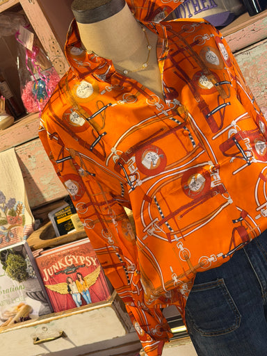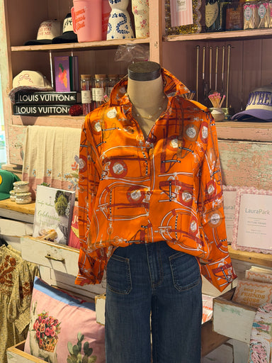 Expertly crafted from luxurious silk, the Herme Silk Top boasts a stunning designer print in vibrant orange. With elegant button detailing and a so...