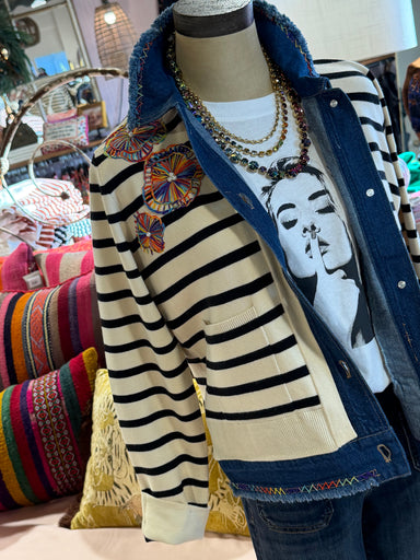 This Millet Floral Cardigan Top features a net cream and black stripe design with denim details, and is adorned with delicate embroidery floral but...