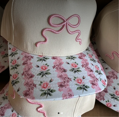 Add a touch of feminine charm to any outfit with the Floral Coquette Hat. This adorable hat features a floral bill and a custom embroidered bow for...