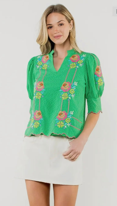 "Get ready to bloom in style with our Montana Rose Top! Made from a beautiful green textured fabric, this top is accented with embroidery detailing...