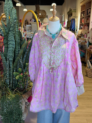 The Tiffany Grace Top features a pink floral pattern made from 100% cotton, ensuring breathability and comfort. Its design includes a contrast coll...