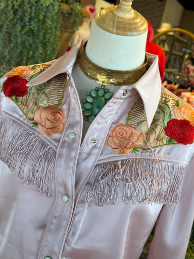 This Pale Pink Button Up blends Western fashion with timeless devotion, featuring a striking depiction of Our Lady of Guadalupe framed in rich, vib...
