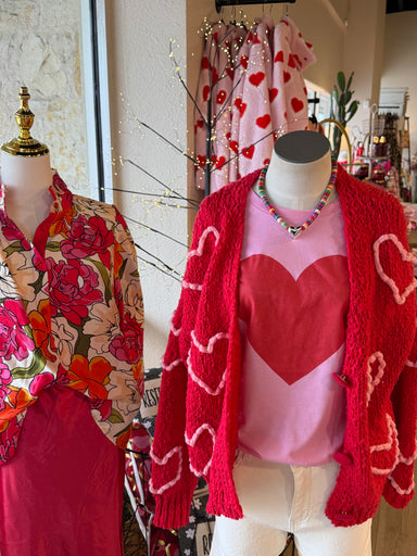 Introducing the Heart Satin Top, featuring a beautiful blush and red heart print on luxurious satin. With a Dolman style and roomie fit, this top i...