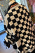Roomy fit. Black and white checkered cardigan. Pairs great back with all the graphic tees.