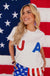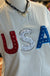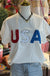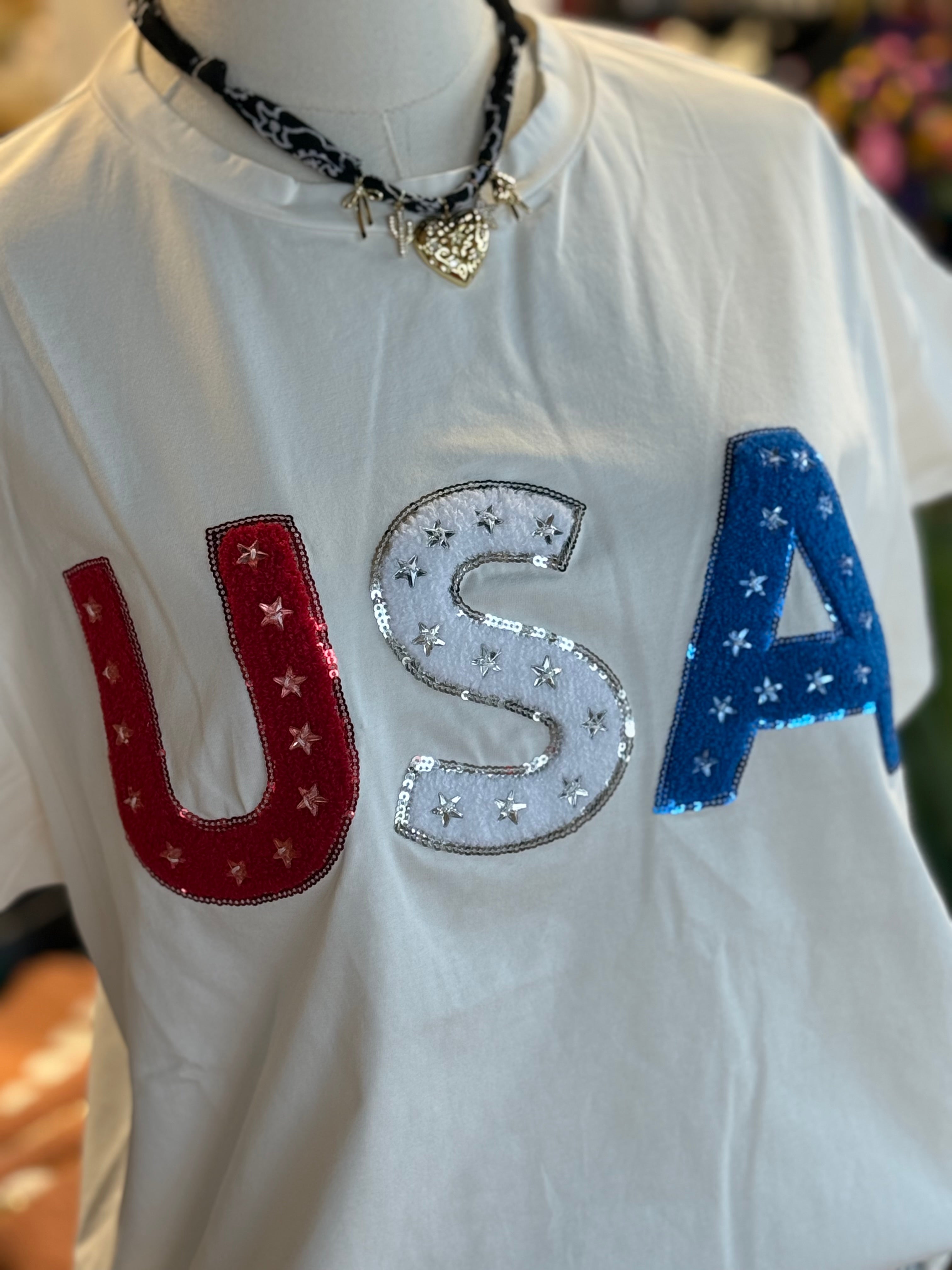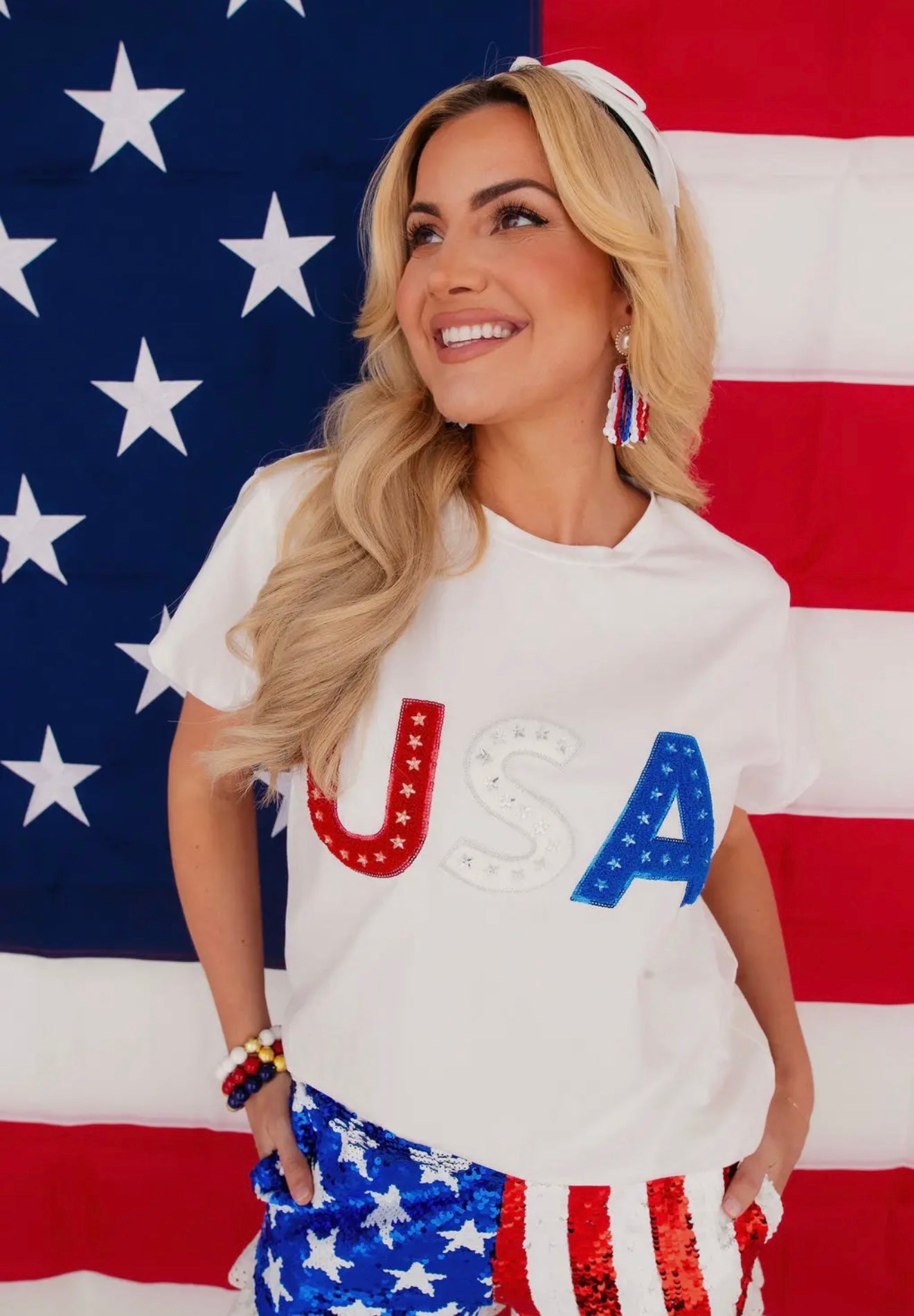 Red White and Bling USA T-Shirt features chenille USA lettering with sequin outline and rhinestone stars inside of the letters