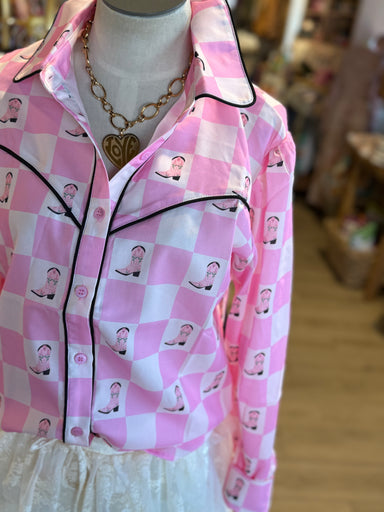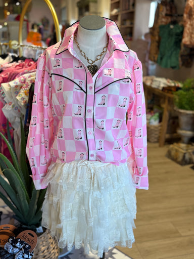 This Checkered Cowgirl Top features a stylish pink and white button print, accented with black piping. Made for the modern cowgirl with a fashionab...