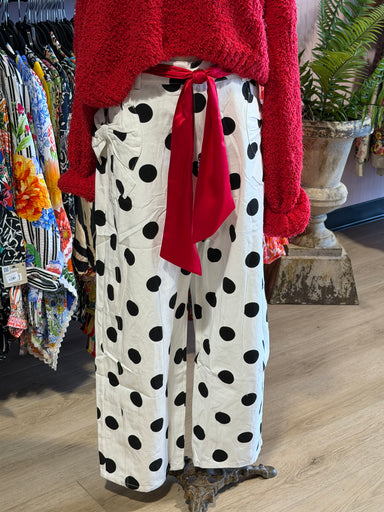 $69.00| /Polka dot printed barrel denim pants with bow pocket. Total Length: 37" Content: 65% Cotton, 35% Polyester plus size in store. Reg is a preorder 1/20