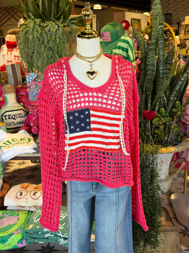 The front displays a simplified flag graphic with white stars on a blue field and red stripes on a white background. The sweater has a relaxed fit,...