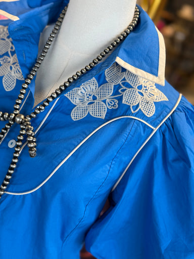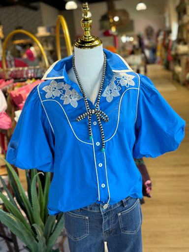 Introducing the Preslee Anna Top, a stunning western-inspired blouse featuring intricate blue embroidery and a subtle puff sleeve. Elevate your war...