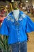 Introducing the Preslee Anna Top, a stunning western-inspired blouse featuring intricate blue embroidery and a subtle puff sleeve. Elevate your wardrobe with this elegant and unique piece, perfect for any occasion.