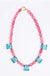 Turquoise trapezoid pendants mixed with pink glass and rust spacers. 21” long.