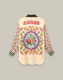 Classic long sleeve collared shirt with two front pockets with flaps. Print is black denim. Back reads,”AMORE” across the top. Pair with our matchi...