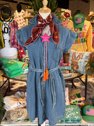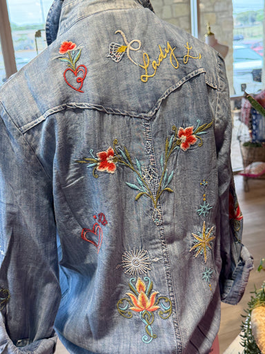 The Tasha Top is a denim button-down made from 100% tinsel, offering a lightweight and breathable fabric ideal for comfort. Its embroidered messagi...